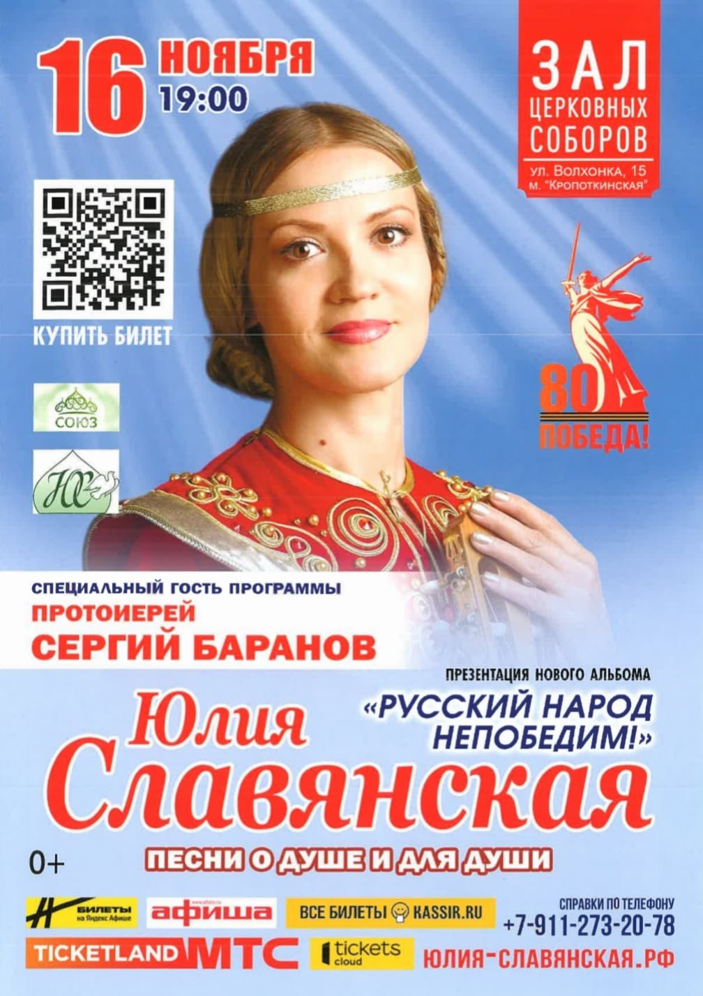 16 Ноября в 19:00 в Зале Церковных Соборов пройдет концерт с презентацией нового альбома Юлии Славянской Русский Народ Непобедим