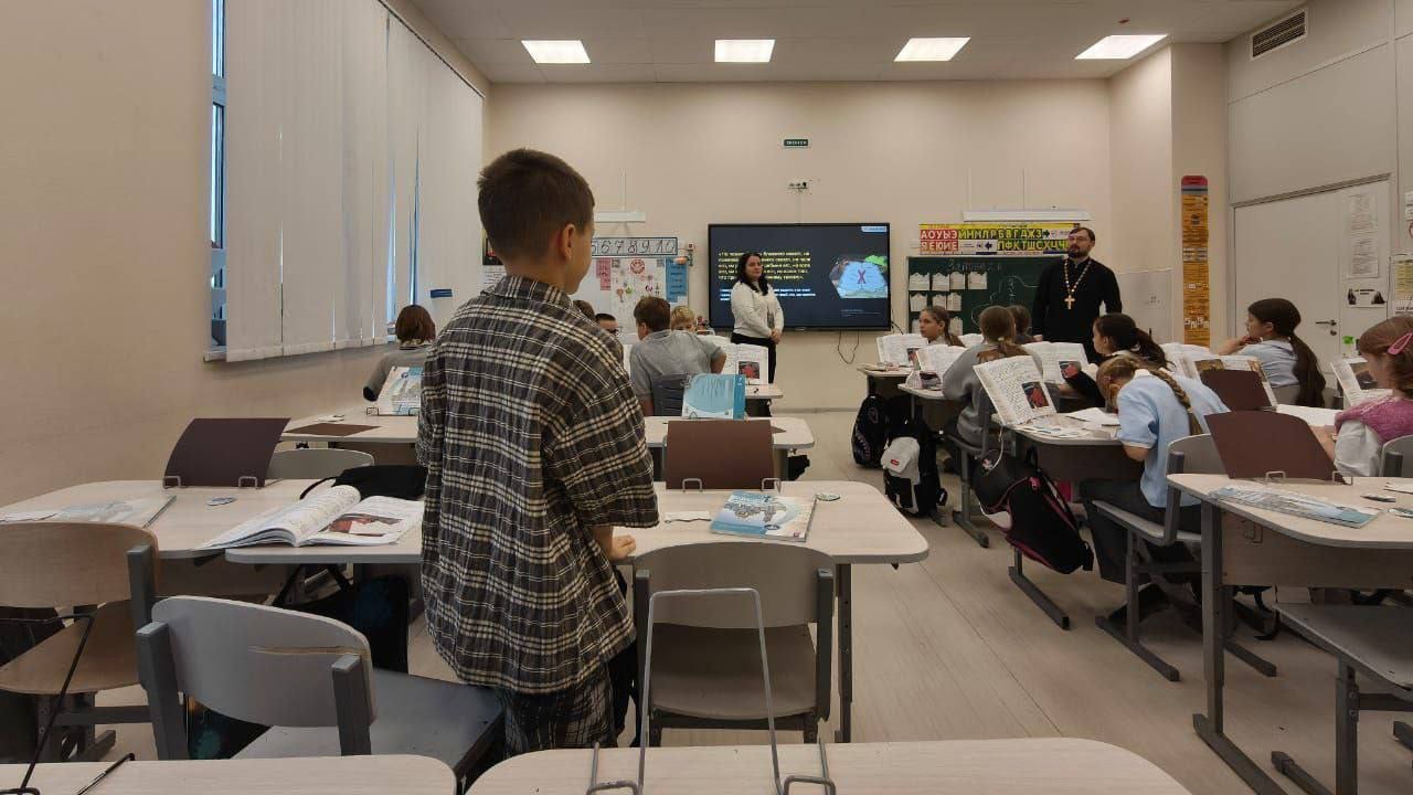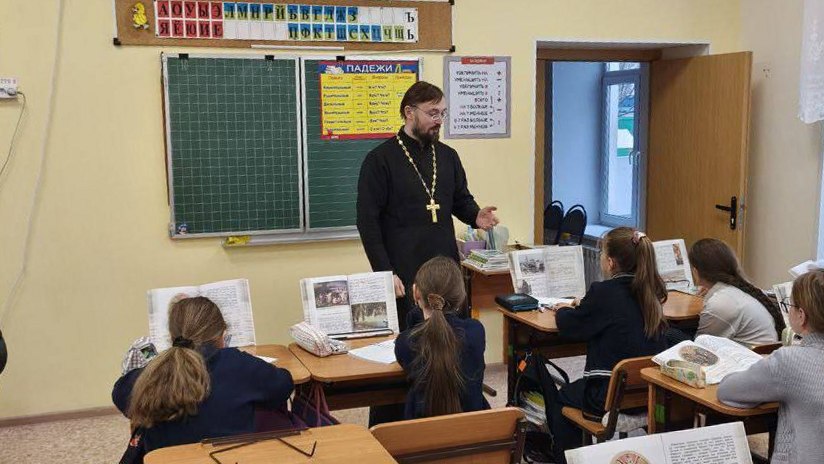 В прошедшем 2025 г. общественный методист иерей Евгений Ильницкий посетил последние уроки ОПК в 2 школах: