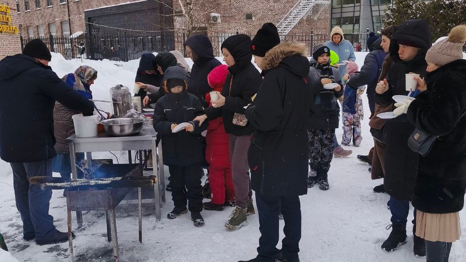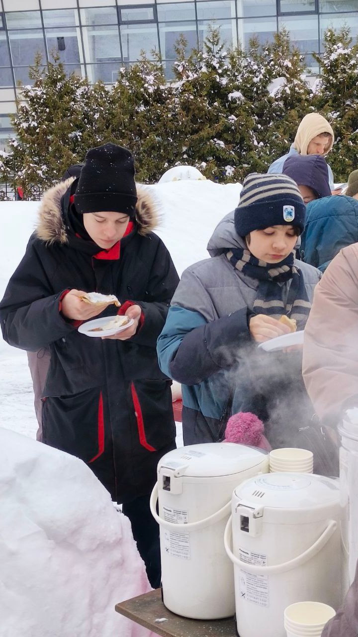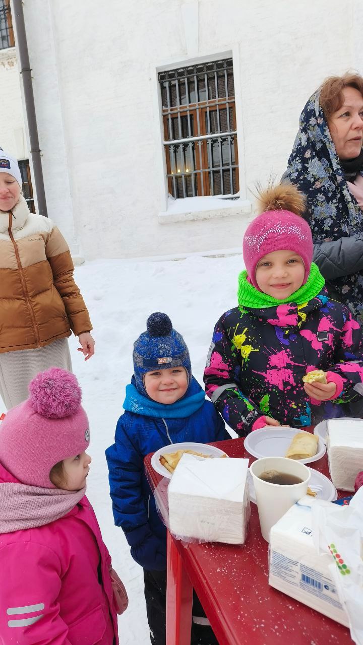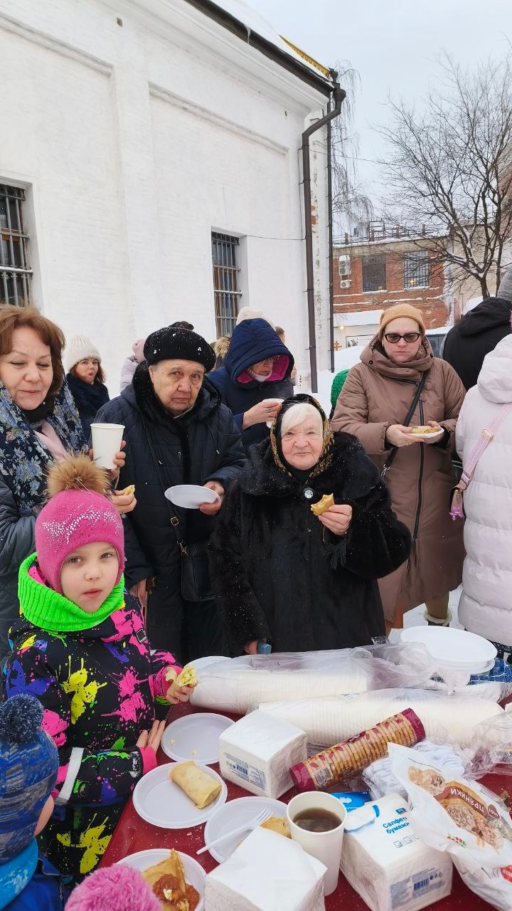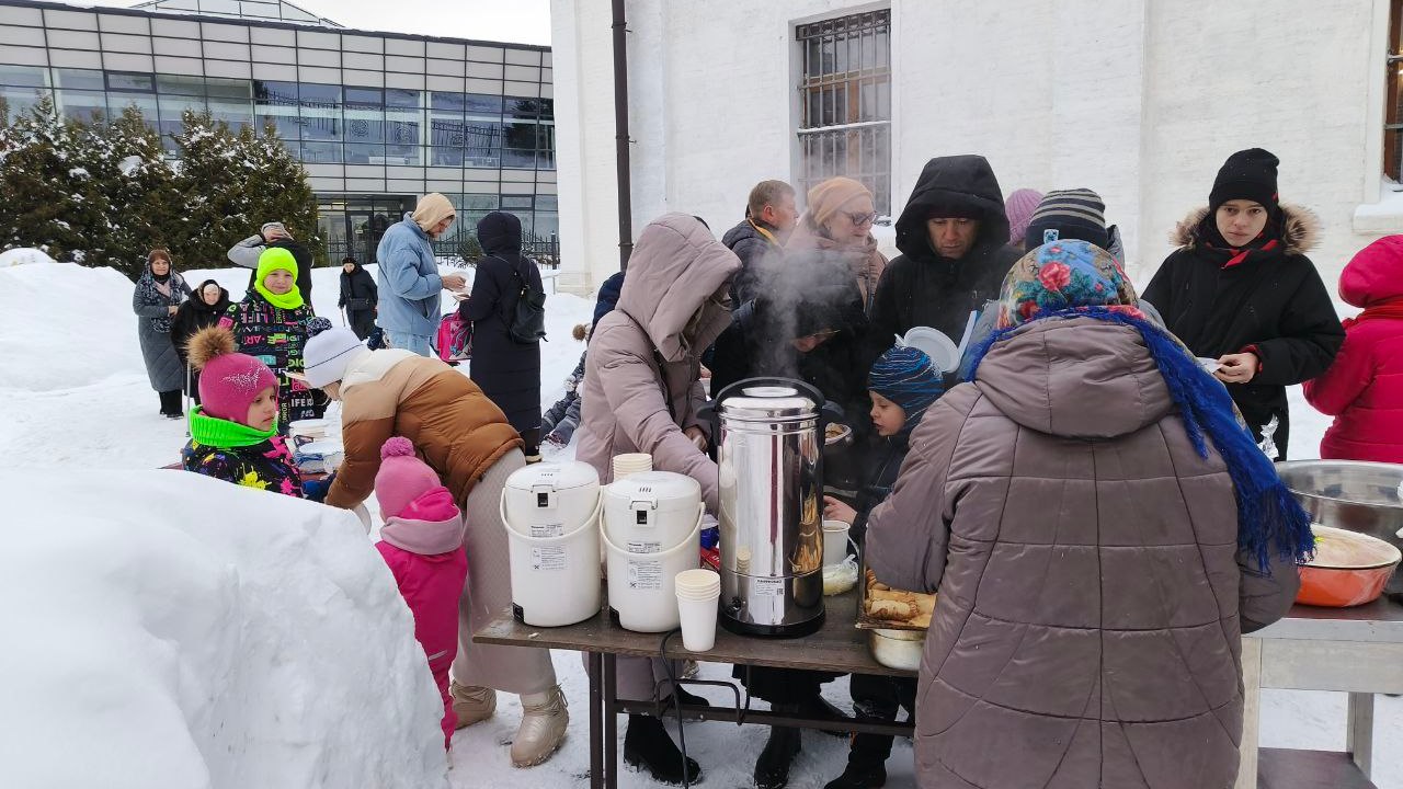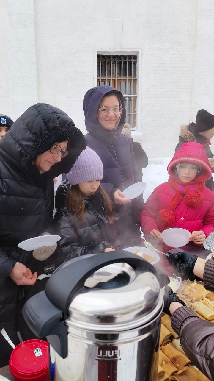 В субботу 21 февраля 2026 года на сырной седмице после Божественной литургии прихожан и детей из воскресной школы ждало традиционное угощение - блины, с разнообразными начинками (творожной, с луком и яйцом, с грибами, с капустой). Чтобы не замерзнуть всем предлагали угоститься горячем чаем и глинтвейном. Были на угощение и рыбные шашлычки!